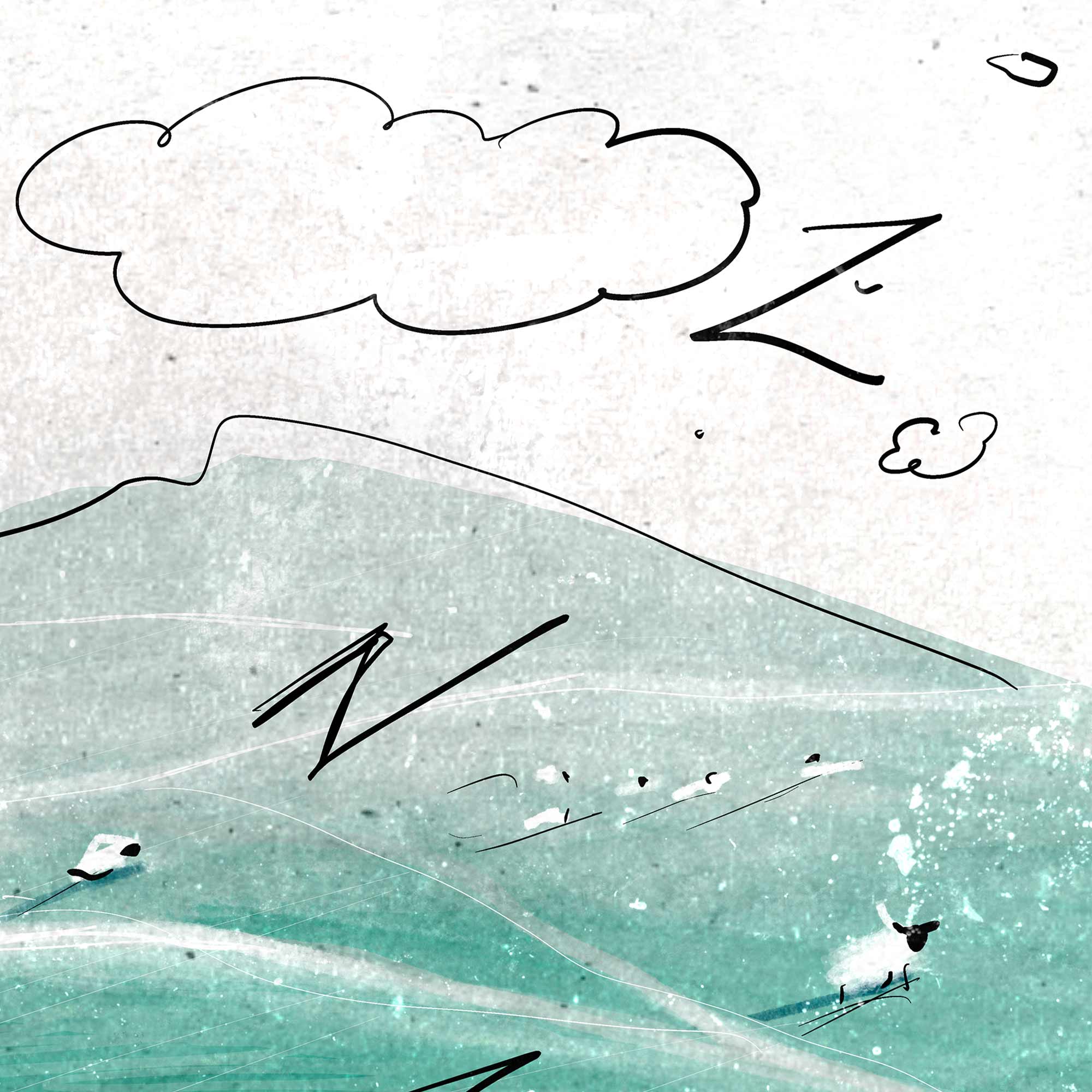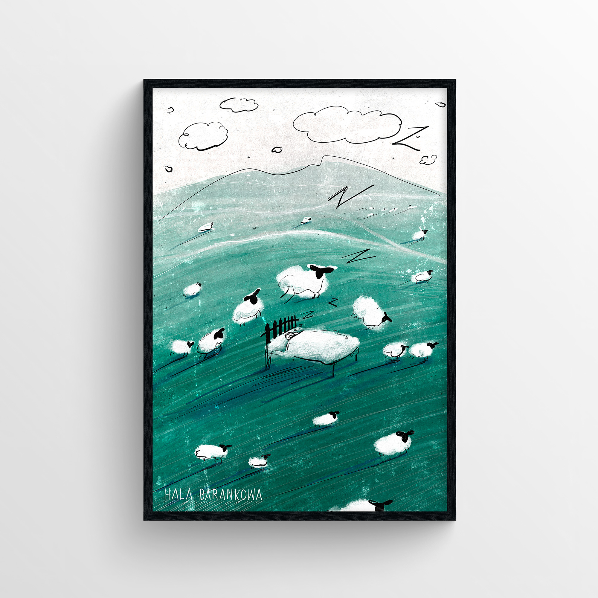 Gdy myślałam o Hali Barankowej, to kojarzyła mi się z liczeniem owiec przed snem. Namalowałam siebie, która śpi w łóżku zbitym z płota, przez, który przeskakują babiogórskie owce. I rozsiane są po całej hali. A w tle delikatnie majaczy nam Babia Góra. Widzimy jej zarys wyłaniający się z tego idyllicznego, sennego krajobrazu. Poczujmy się jak w śnie.